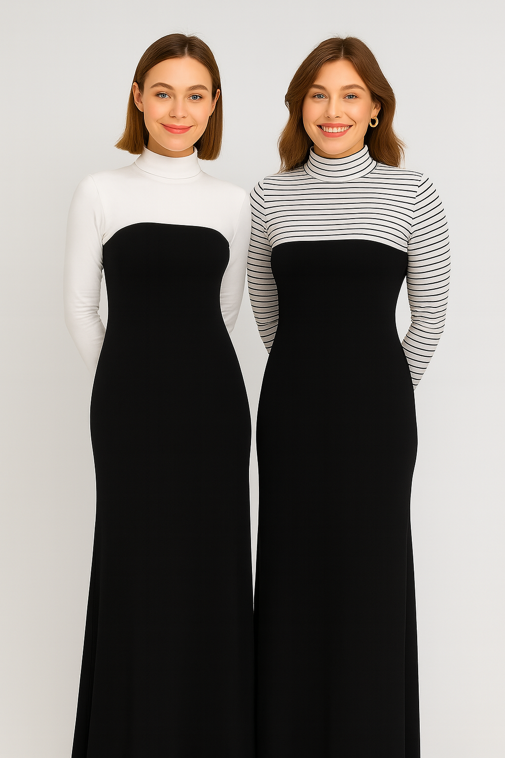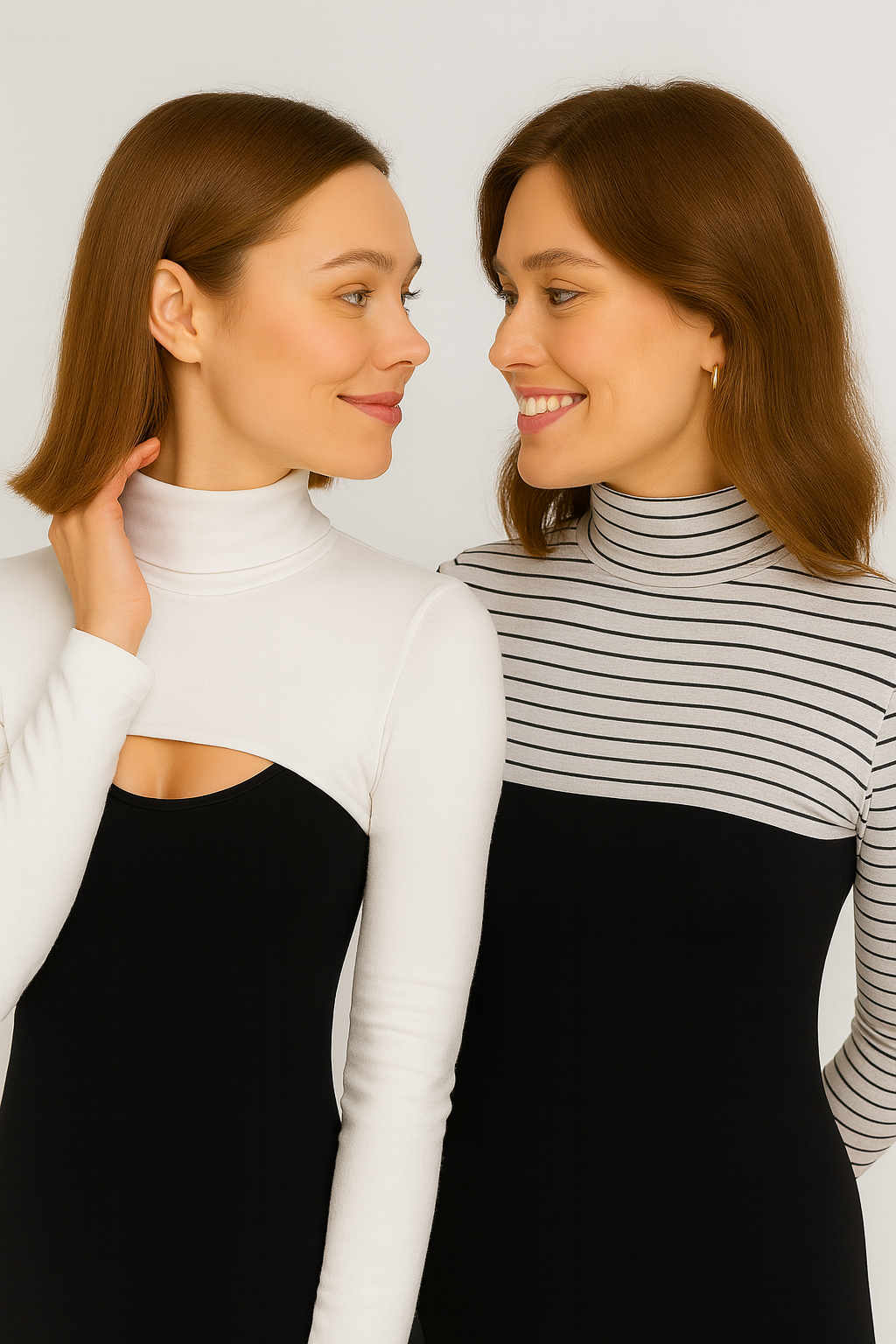 2’li Paket Dik Yaka Boyunluklu Kolluk Seti – Çizgili & Beyaz, gardırobunuzda “her an lazım olan” temel parçaları bir arada sunuyor. Bir pakette iki renk olması, hem stil özgürlüğü hem de ekonomik avantaj sağlıyor.