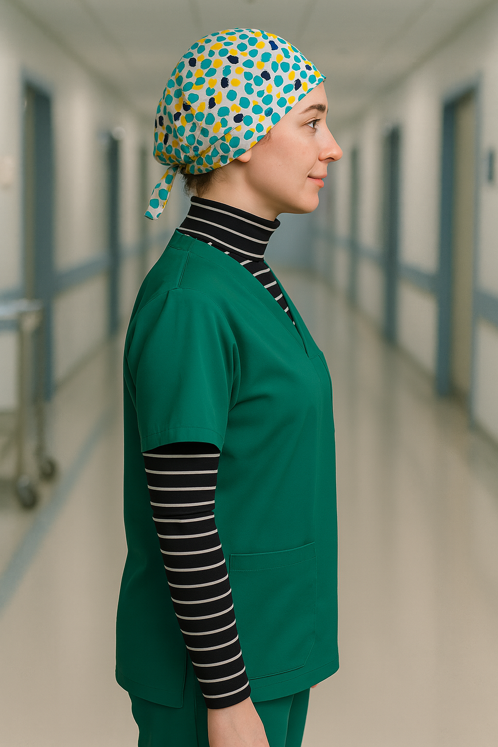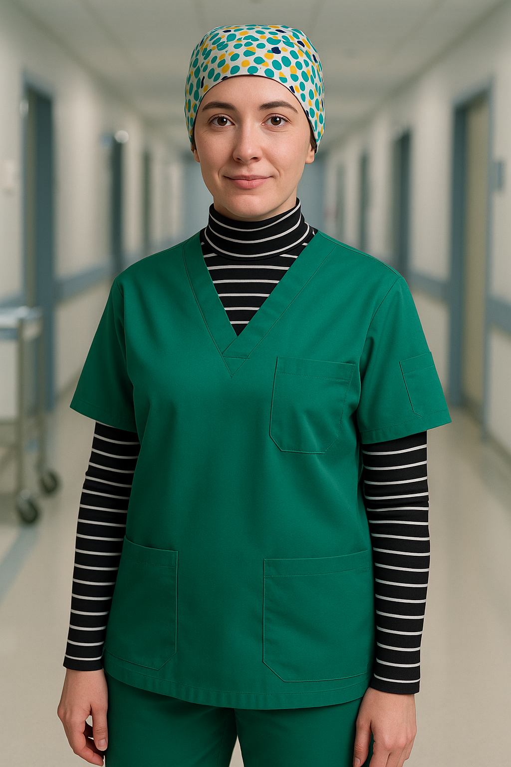- Scrubs Üst Yeşil: V yaka, rahat kalıp, hareket özgürlüğü sağlayan tasarım.
