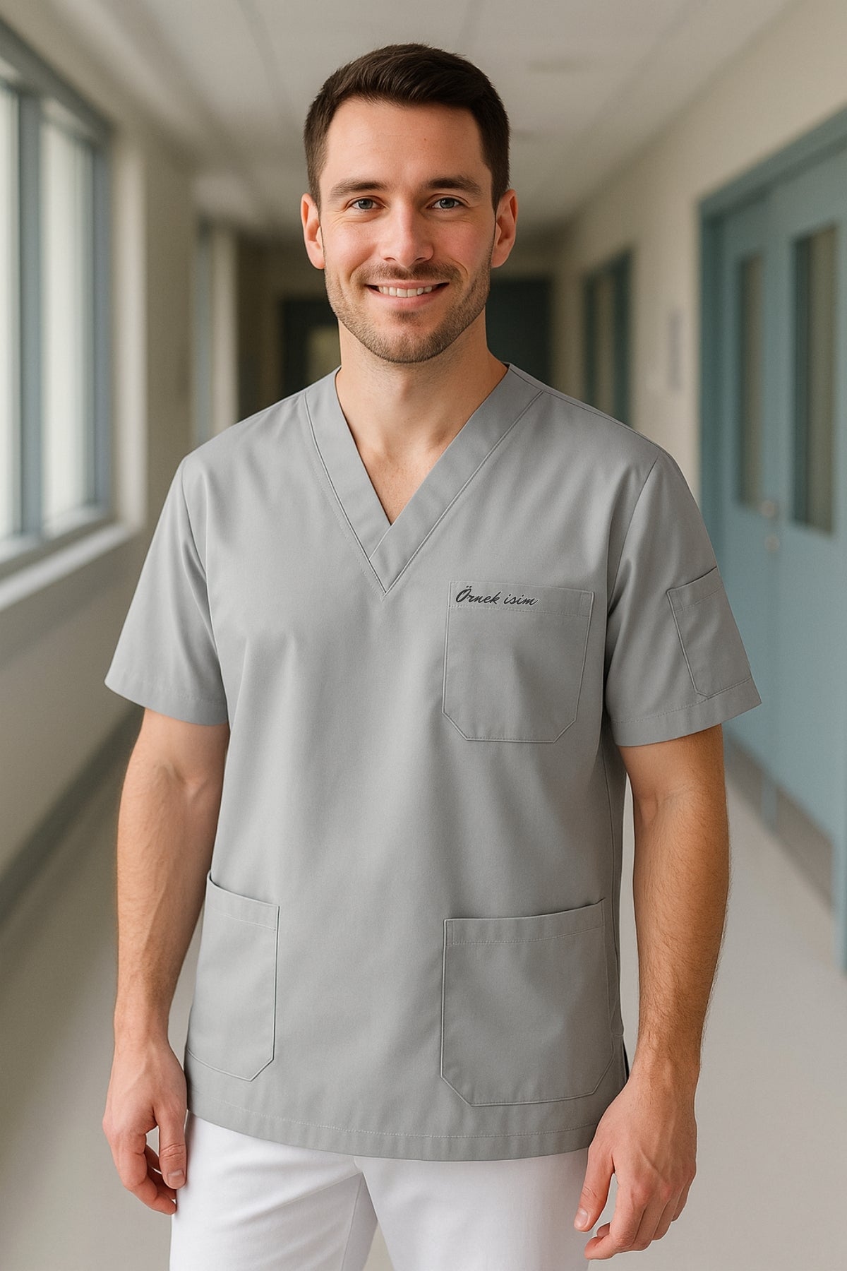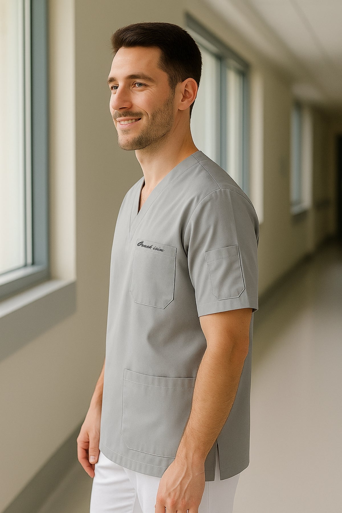 Kişiye Özel İsimli Erkek Tek Üst 4 Cepli Scrubs Forma - Gri