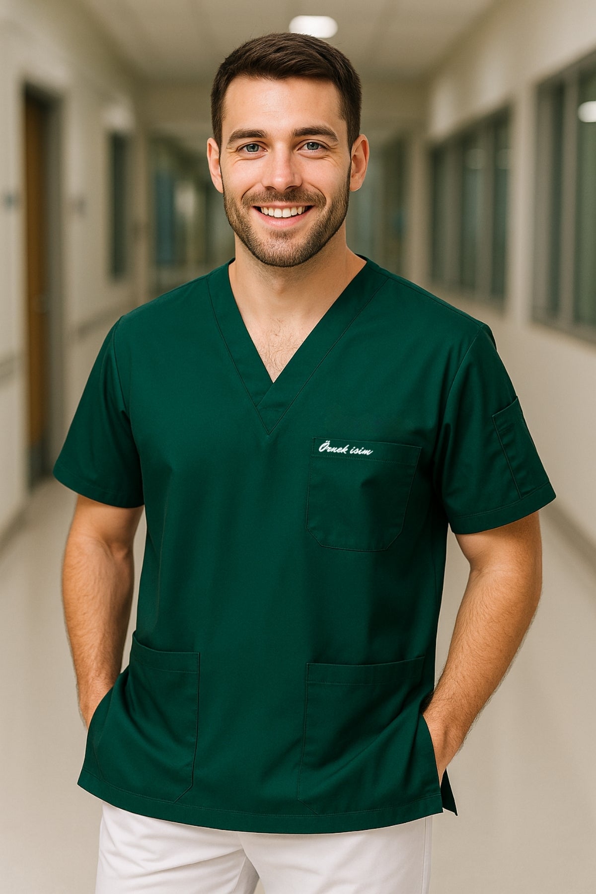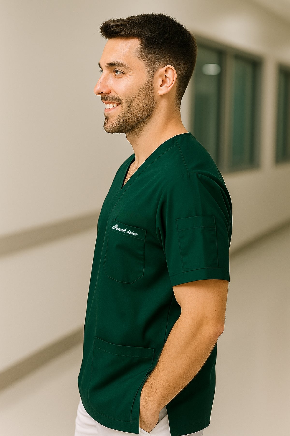 Kişiye Özel İsimli Erkek Tek Üst 4 Cepli Scrubs Forma - Yeşil