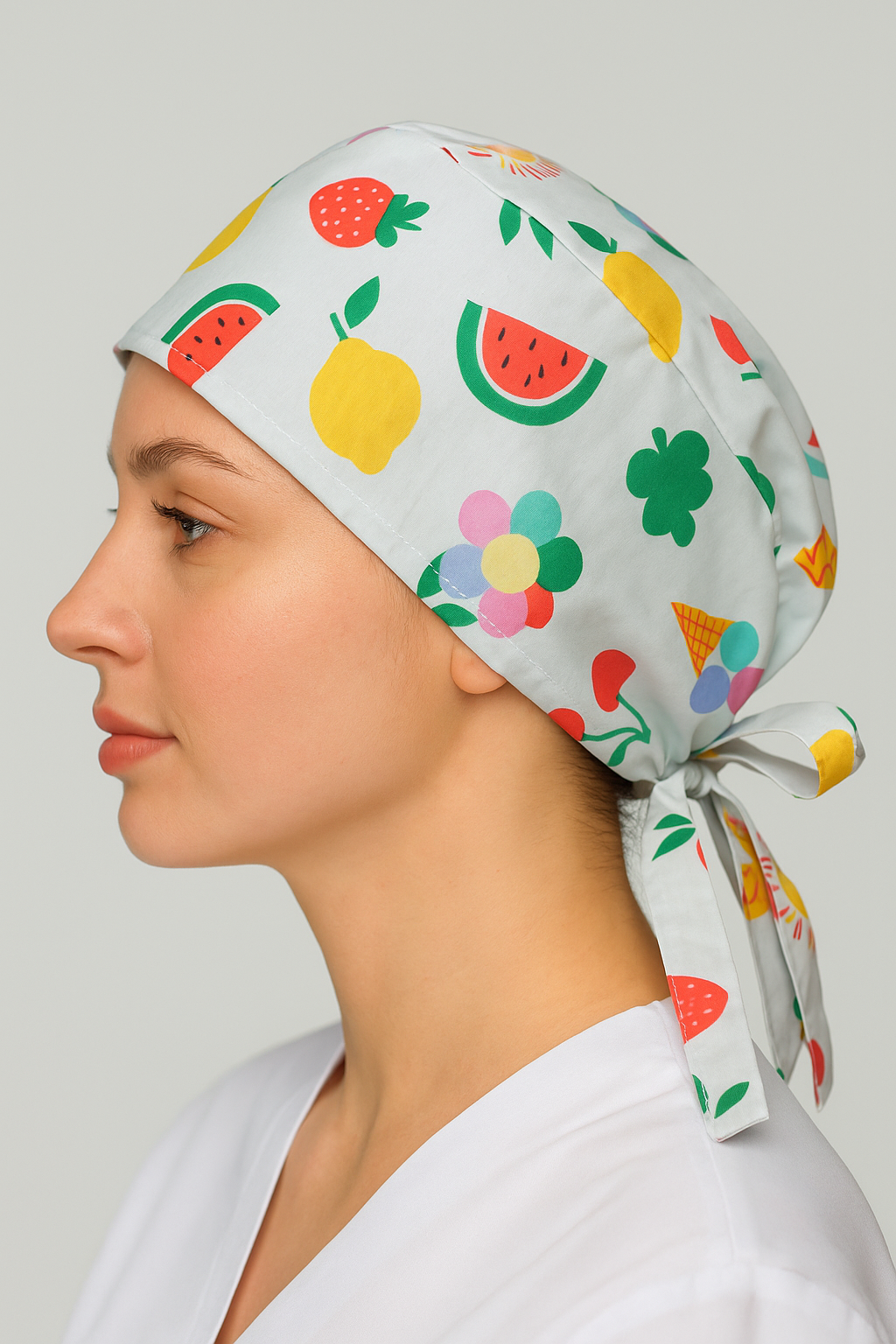 %100 pamuktan üretilen bu meyve desenli cerrahi bone, sağlık çalışanlarının yoğun iş temposuna hem konfor hem de eğlenceli bir dokunuş getiriyor. Doğal kumaşı sayesinde başı terletmez, nefes alabilir yapısıyla gün boyu rahatlık sunar. Arka kısmındaki ayarlanabilir bağcıklı tasarımı, farklı baş ölçülerine kolayca uyum sağlar. Canlı meyve ve gökkuşağı desenleriyle çalışma ortamına pozitif enerji katar.