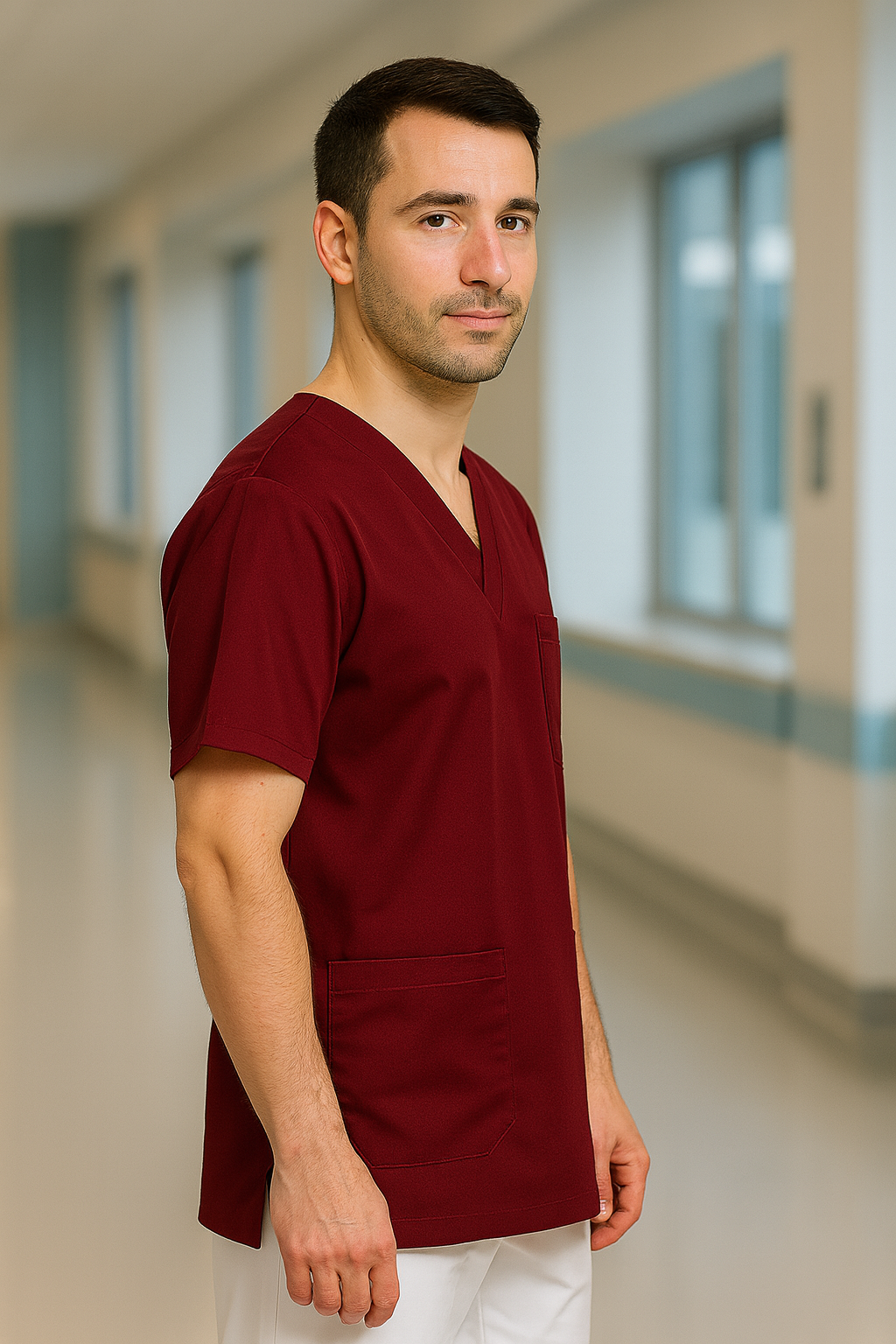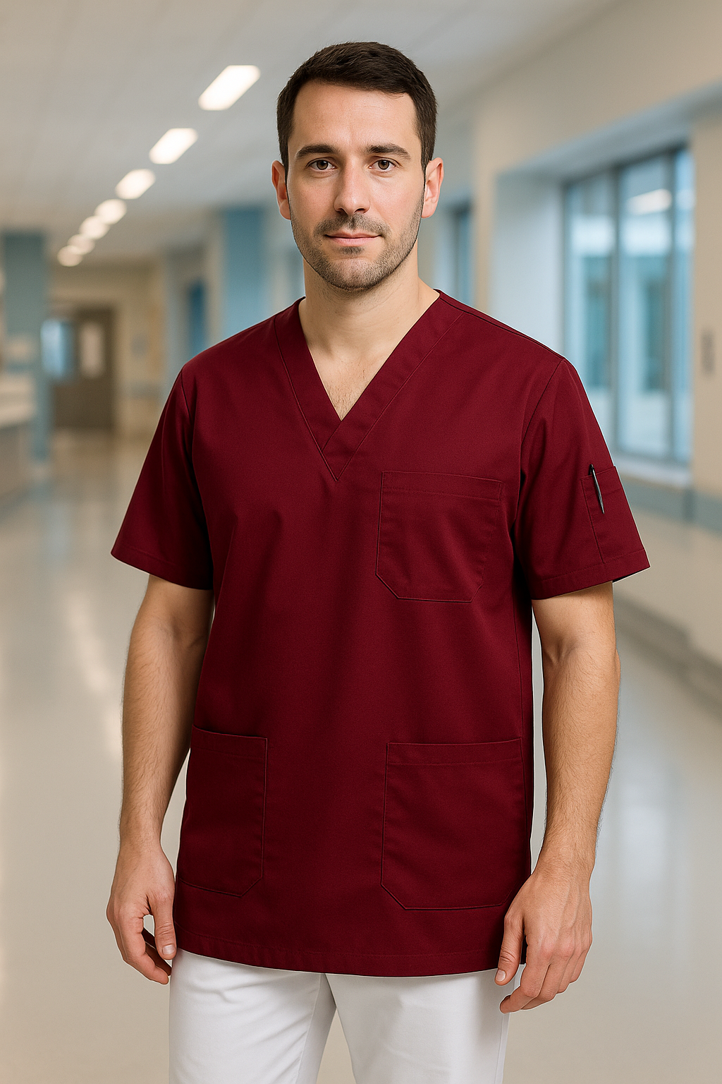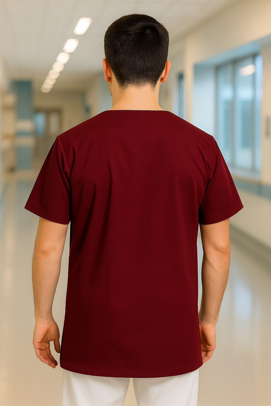 Bordo tek üst scrubs forma, sağlık çalışanlarının uzun saatler boyunca ihtiyaç duyduğu konforu ve dayanıklılığı bir arada sunar. %67 PES ve %33 pamuk karışımı özel kumaşı sayesinde terletme ve solma yapmaz, gün boyu nefes alabilen yapısı ile ferahlık sağlar. Unisex kalıpta üretilmiştir; hem kadın hem erkek sağlık çalışanları için uygundur. Kolay ütülenebilir yapısı ile çok buruşma yapmaz, pratik cepleri ile işlevsellik sunar. Klinikler, hastaneler ve laboratuvarlar için profesyonel bir seçimdir.