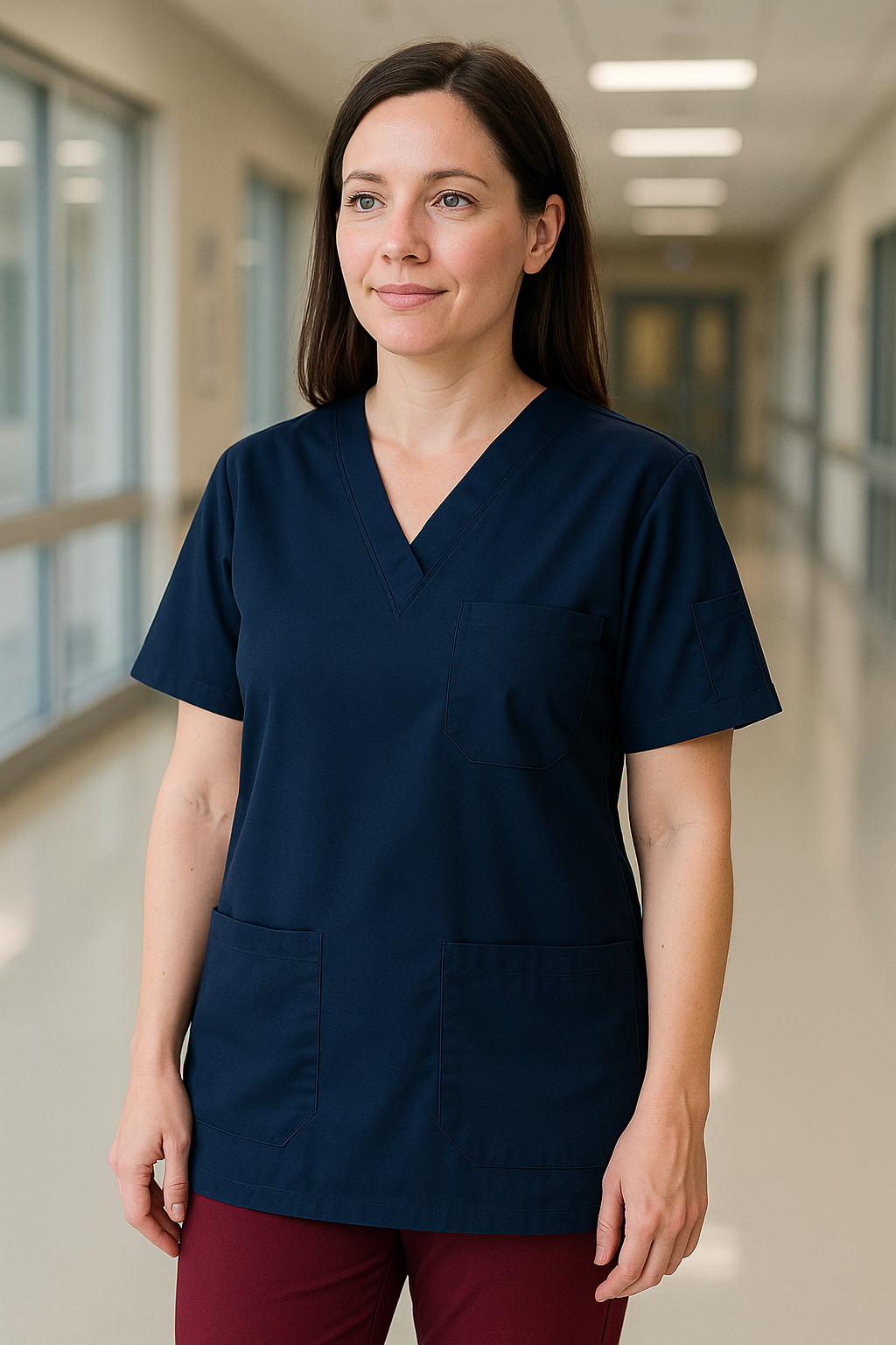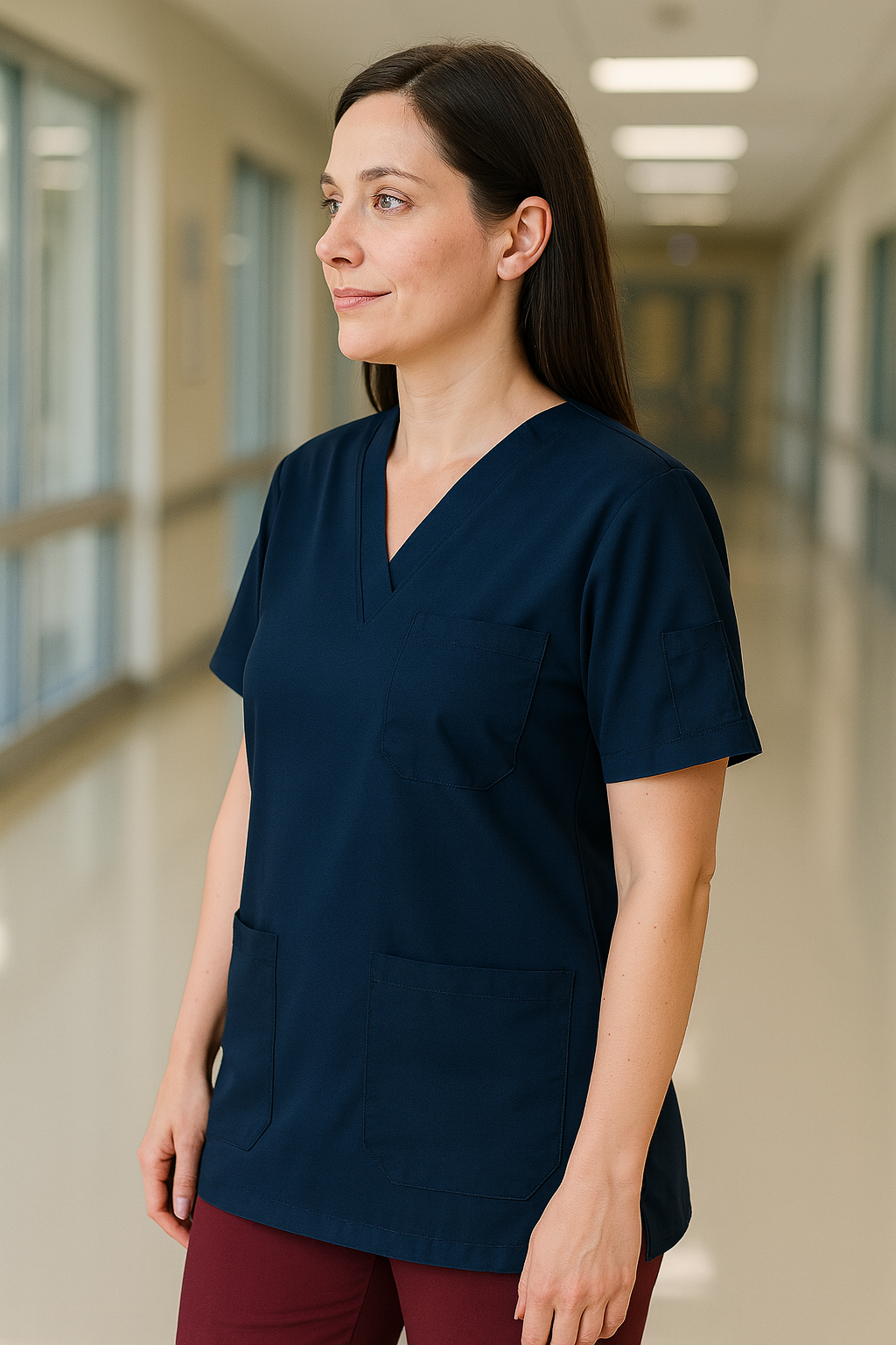 Lacivert tek üst scrubs forma, sağlık çalışanlarının uzun saatler boyunca ihtiyaç duyduğu konforu ve dayanıklılığı bir arada sunar. %67 PES ve %33 pamuk karışımı özel kumaşı sayesinde terletme ve solma yapmaz, gün boyu nefes alabilen yapısı ile ferahlık sağlar. Unisex kalıpta üretilmiştir; hem kadın hem erkek sağlık çalışanları için uygundur. Kolay ütülenebilir yapısı ile çok buruşma yapmaz, pratik cepleri ile işlevsellik sunar. Klinikler, hastaneler ve laboratuvarlar için profesyonel bir seçimdir.