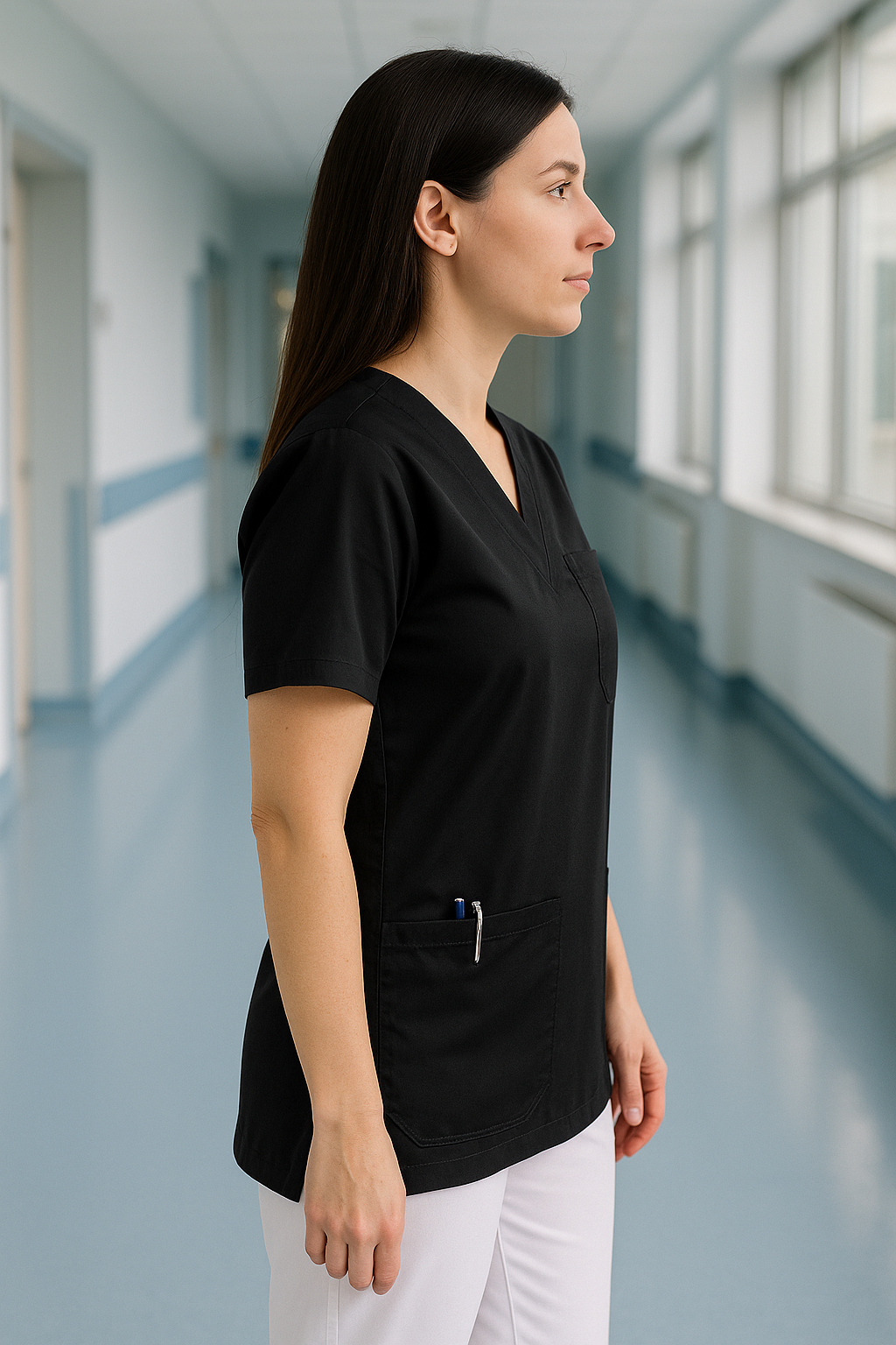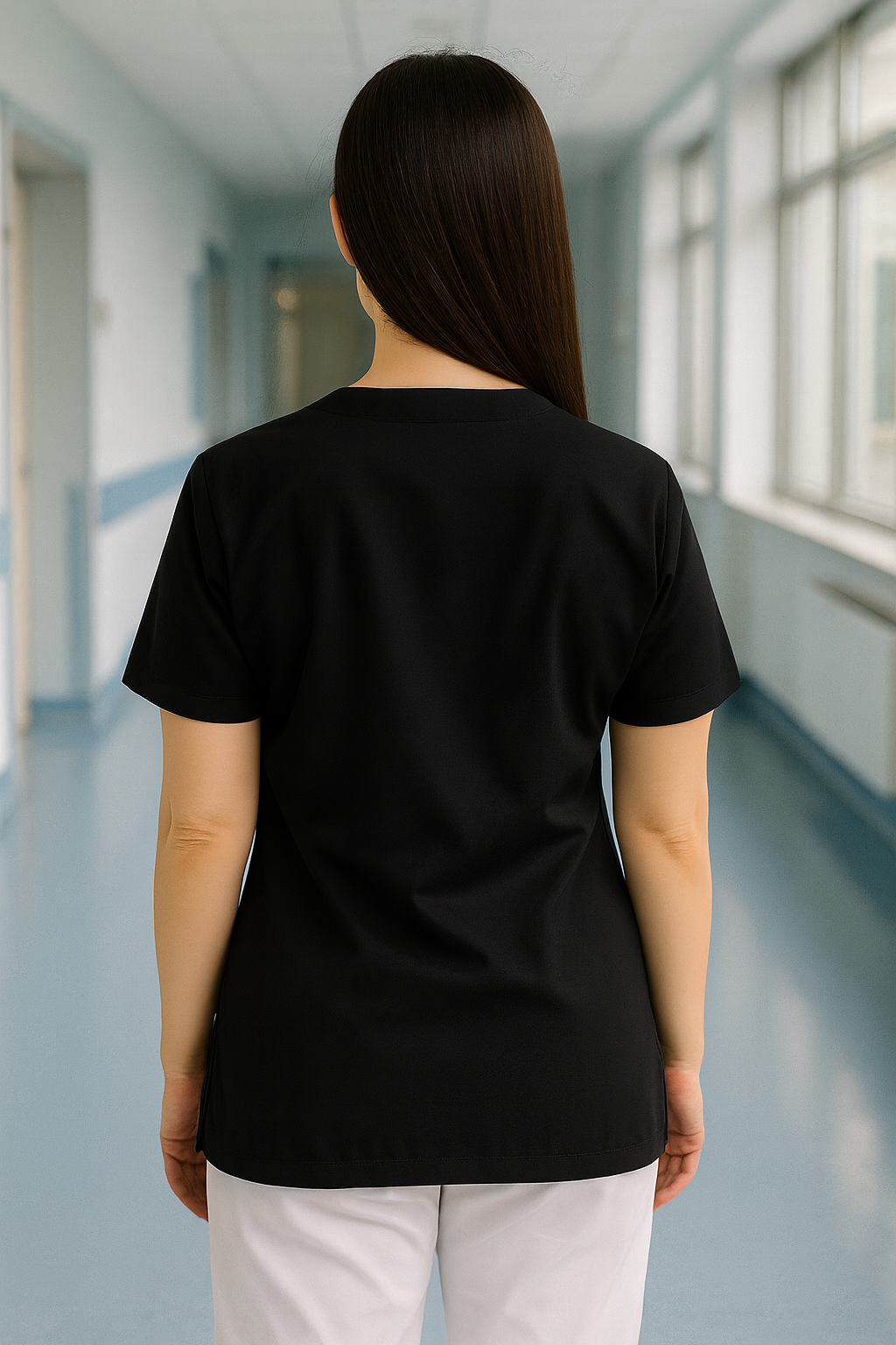 Siyah tek üst scrubs forma, sağlık çalışanlarının uzun saatler boyunca ihtiyaç duyduğu konforu ve dayanıklılığı bir arada sunar. %67 PES ve %33 pamuk karışımı özel kumaşı sayesinde terletme ve solma yapmaz, gün boyu nefes alabilen yapısı ile ferahlık sağlar. Unisex kalıpta üretilmiştir; hem kadın hem erkek sağlık çalışanları için uygundur. Kolay ütülenebilir yapısı ile çok buruşma yapmaz, pratik cepleri ile işlevsellik sunar. Klinikler, hastaneler ve laboratuvarlar için profesyonel bir seçimdir.